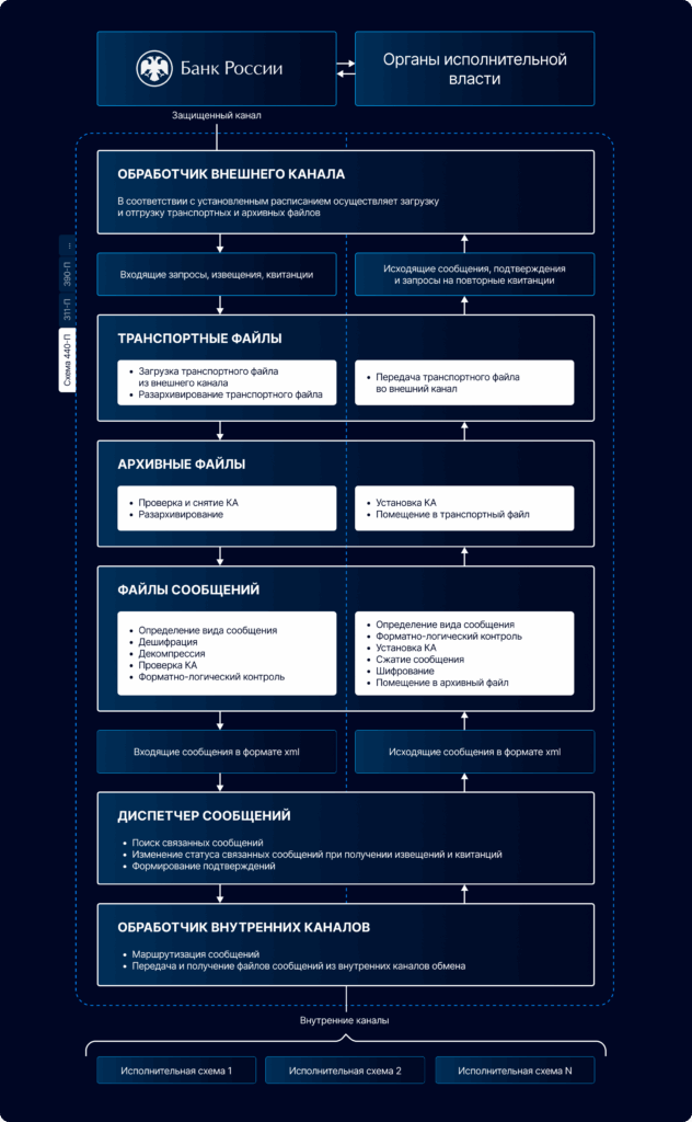 Примерами схемы 1-го типа является исполнение таких положений банка России как «440-П» — запросы и постановления Федеральной налоговой службы или «390-П» — то же от Федеральной таможенной службы). По 2-му типу взаимодействия реализуются требования положений «311‑П» — передача сведений об открытии, закрытии или изменении реквизитов счётов клиентов), «655-П» — передача сведений в адрес Федеральной службы по финансовому мониторингу, указания «4512-У» — передача уполномоченными банками информации органам валютного контроля.