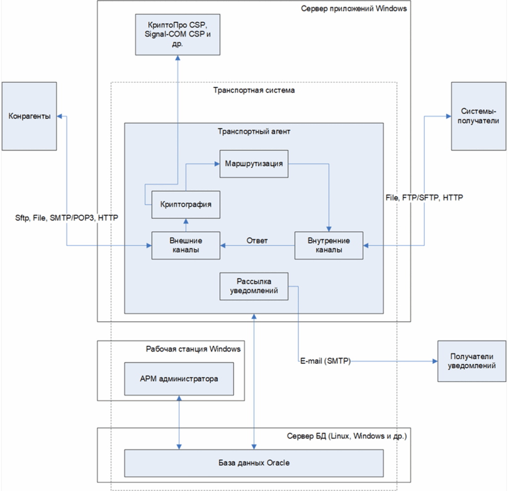 Решение построено по двухзвенной архитектуре клиент-сервер. В качестве базы данных используется СУБД Oracle. Клиентские приложения (транспортный агент и программа администрирования) созданы на платформе Microsoft.Net. Взаимодействие клиентского приложения с сервером происходит с помощью Oracle Client по протоколу TCP/IP.